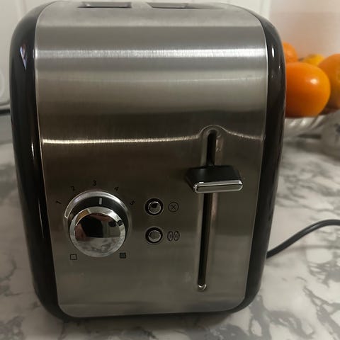 KitchenAid brødrister i rustfritt stål og svart farge. Har to brødristerspor og justerbar bryter for innstillinger.