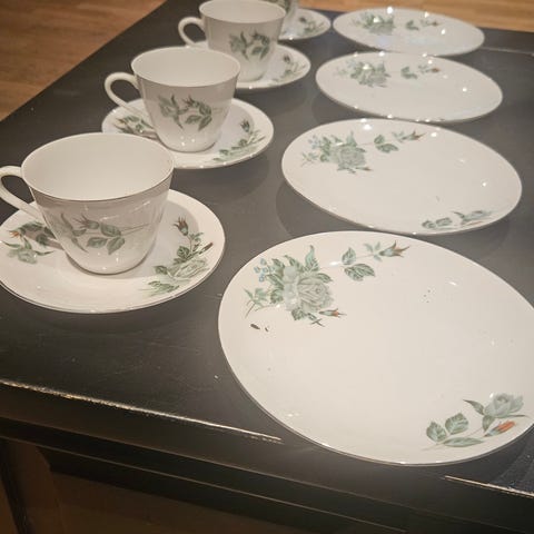 Settet inkluderer kaffekopper med hanker og tilhørende tefat/asjetter.