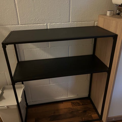Vinhylle som også kan brukes som vanlig hylle. Stått i en innendørs bod hos oss.