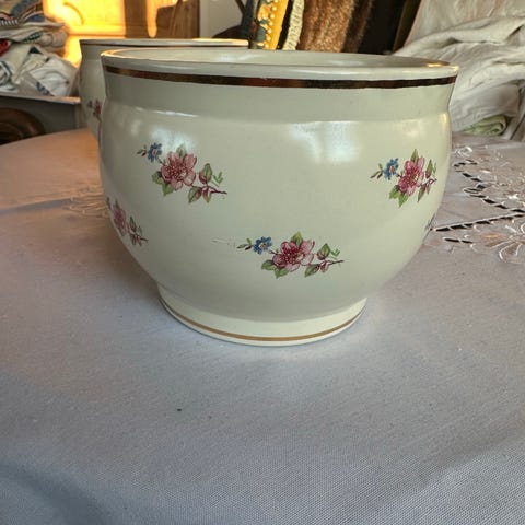 Servise i blått og hvitt mønster bestående av flere skåler, en stor kurvsskål( 23 cm i diameter )med håndtak, og salt- og pepperbøsser. Serviset har dekorative blå blomster- og landskapsmotiver på hvit porselen.