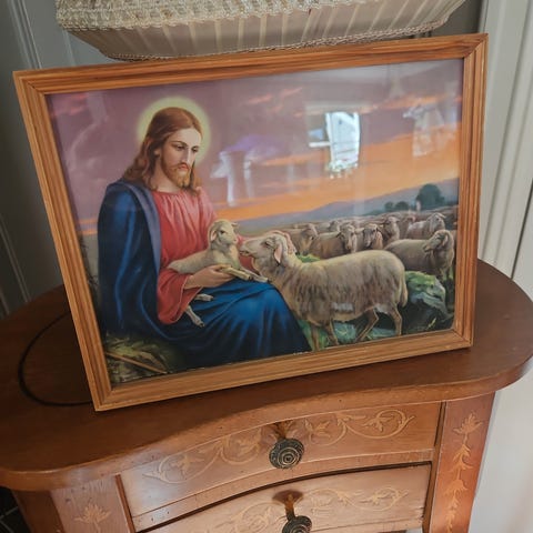 Gammelt relgiøst bilde med plastramme. En bit av rammen er knekt