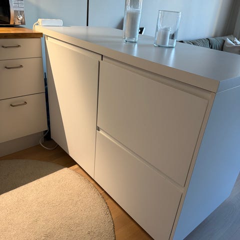 Benkeplaten passer på toppen av IKEA-skrog og har da et lite overheng for sitteplass på kortenden.
