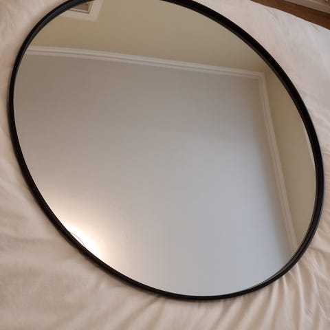 Granit rundt veggspeil med svart ramme. Speilet har opphengsdetaljer på baksiden for montering på vegg.