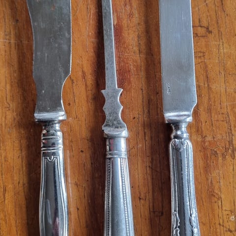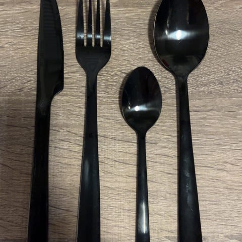 10 gafler, 9 kniver, 9 spiseskjeer, 7teskjeer