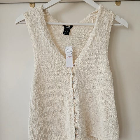 Vintage vest fra Lindex i pent mønster. Rett passform uten innsving – klemme brukt bak på første bilde for visning. Laget av 50 % akryl og 50 % bomull. Str. 42/44. Pent brukt og i god stand. Fin alene eller lag-på-lag ✨