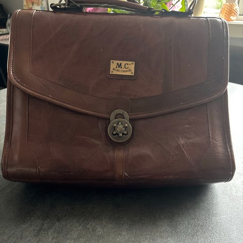 Selger en stilig veske videre. Usikker på om dette er lær eller skinn eller ingen av delene. Ukjent merke/opphav.