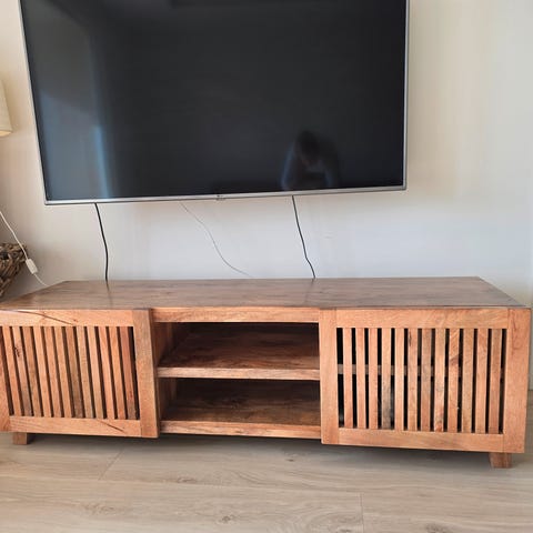 Tv benk i eikefiner med 2 sjalusidører.