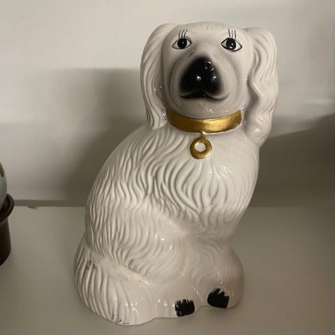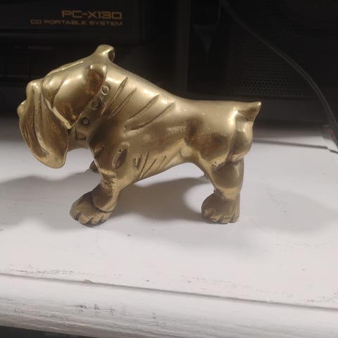 Sort hundeskulptur med geometrisk design. Sittende labrador i stilisert form. På størrelse med en knyttneve.