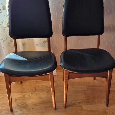 Stolene fremstår i god vintage stand, men med naturlig bruksmerker etter et levd liv. (Den ene stolen har fått litt malingsflekker som sikker kan vaskes bort, se siste bilde)