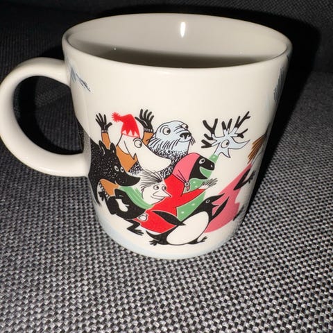 Arabia Fillyjonk kopp med illustrasjoner i farger. Koppens design inkluderer karakterer fra Moomin-universet. Laget av keramikk, egnet for oppvaskmaskin og mikrobølgeovn.