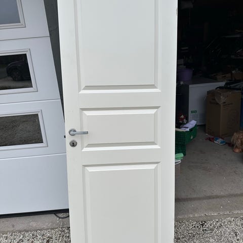 Dørblad er ca 5 år gammelt mens dørkarm er gammel og malt hvit. Dørkarm fikk noen skader ved demontering.