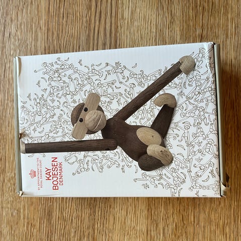 Helt ny og ubrukt apekatt i størrelse mini fra Kaj Bojesen selges. Fått i julegave uten byttelapp, men har tilsvarende fra før og selger den derfor. Apekatten er kun tatt ut av esken for å ta bilder, ellers aldri brukt eller åpnet utover dette.