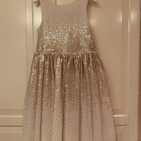 Offwhite med gullfargede paljetter. Brukt kun 2 ganger, fordi barnet vokste så fort. 😅 Kan brukes i både konfirmasjon og bryllup.