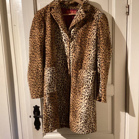 Leopardmønstret vintage fuskepelskåpe fra 2000-tallet med satengfôr. Myk og varm, med kortere (cropped) lengde og klassisk rett passform. Markert krage og tydelig statement-design. Enkel å style både til hverdags og mer pyntede antrekk.