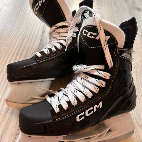 Hockey Canada 730 ishockeyskøyter i størrelse 42. Skøytene er designet for ishockey og har en svart og sølvfarget overflate med hvite lisser og hvit knivholder. Skøytene er egnet for bruk på isbaner og har en robust konstruksjon tilpasset ishockeyspillere.