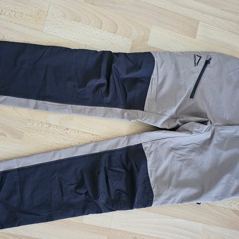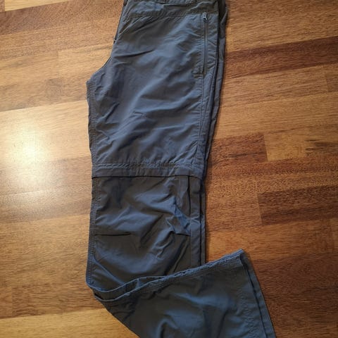 Pen anvendelig lett turbukse. Stramminger i liv og nede ved beina. Beninnerlengde ca 76. Liv målt tvers over 42 cm. Buksa har glidelåslommer og åpne sidelommer