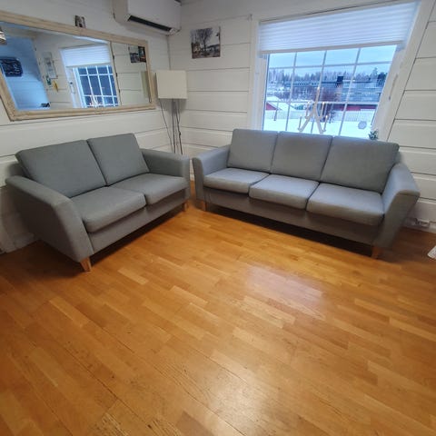 Solid sofa uten synlige skader og merker. Stått i dyrefritt og røykfritt hjem. Mål 265x 210cm.Sittehøyde 45cm, dybde 92cm. Kjøpt på Skeidar. Merke Hjort Knutsen.