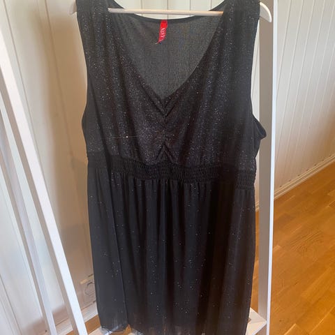 KappAhl festkjole i svart fløyel, størrelse XL for kvinner. Kjolen har lange ermer og er laget av mykt fløyelsmateriale, egnet for formelle anledninger og festbruk.