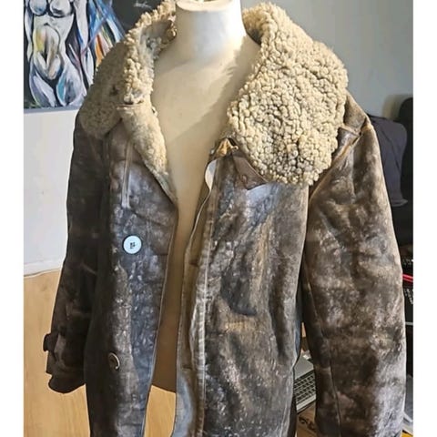 Fox Brothers & Co. Ltd. uniformjakke laget av fincloth materiale, produsert i West of England. Jakken er utstyrt med et brunt lærbelte (Sam Browne-belte) følger med og har militære insignier. Passer til bruk som uniform eller samlerobjekt. Str. 48. 2 skjorter, bukse og lue ( str 58) følger med. Innlegget i bremmen er knukket. Årgang 1985