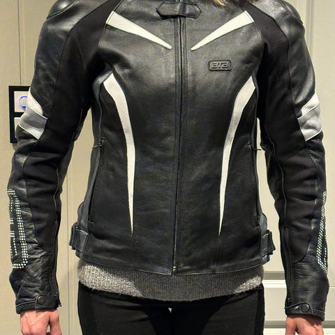 Vintage skinnjakke for herre i størrelse EU 60 / US 50. Jakken er svart og laget i skinnmateriale. Den har detaljer som quiltet mønster på skuldrene og broderte tekster på brystet og ermet.