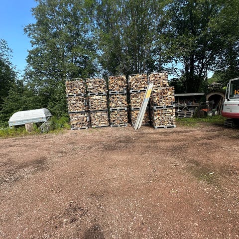 Kappet på 30cm og kløyvd i profesjonell vedmaskin som sorterer ut mye av bøsset og fliser.