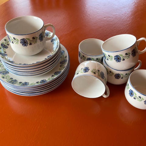 Fullt kinesisk porselensservise, 6 desserttallerkener, kaffeskåler og kopper. Ukjent alder, men gammelt.