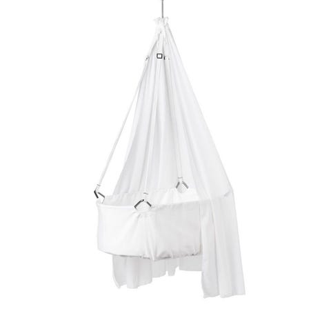 Pent brukt Leander Vugge barneseng i hvit farge. Laget av slitesterkt materiale, designet for barn. Passer til bruk som vugge for nyfødte og småbarn.