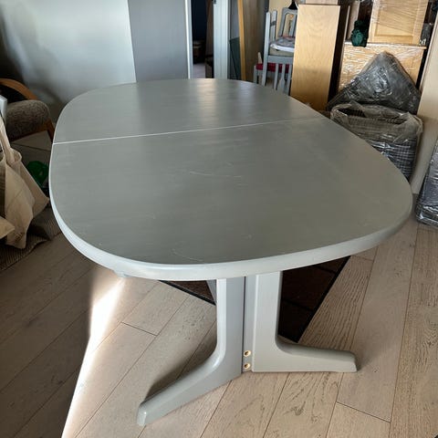 Bord i eik finer i retro design med myke, runde kanter. Pent brukt uten skader.