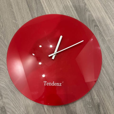 Denne klokken er beregnet til å henge på veggen. Den har vært stablet vekk i et skap. Jeg vet ikke noe om verdi. Ikke noe merke. Det er i hardplast. Ingen merker eller skader