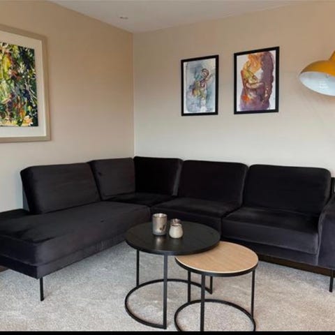 Selger en shibuya hjørne sofe fra Skeidar i fargen LettoAntrasitt Velur med sorte stål ben. Sofaen har et moderne, stilren design som passer inn i de fleste hjem.