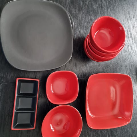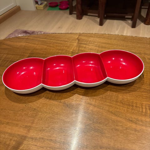 Tupperware servise bestående av flere røde skåler i ulike størrelser. Skålene har en blank rød overflate innvendig og en lysere ytre farge. Egnet til servering av mat og snacks..