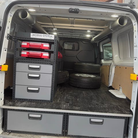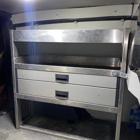 Verktøyskap og oppbevaringsløsning for varebil med skuffer og hylle