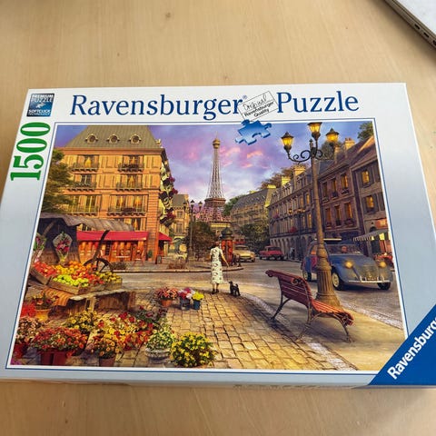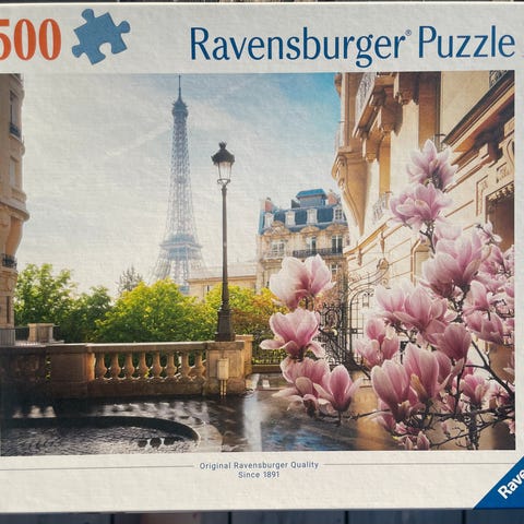 Ravensburger 1500 brikker puslespill med motiv av Eiffeltårnet i Paris. Har bilde av ferdig lagt puslespill hvis ønskelig. Kan hentes eller sende