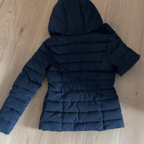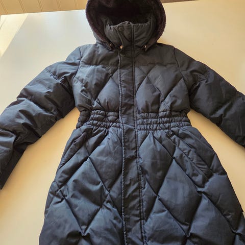 God og varm vinterkåpe med avtagbar hette til jente, merke Tommy Hilfiger. Belte i livet, kan tas av.