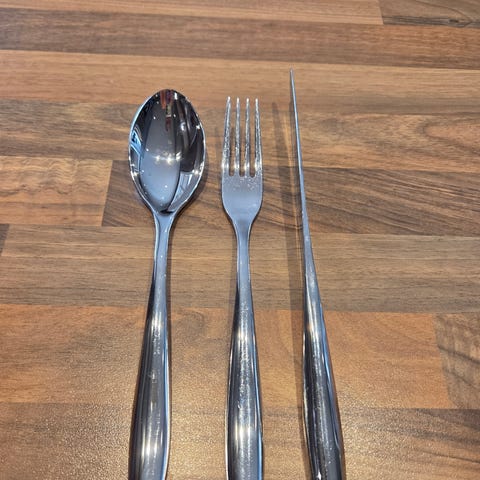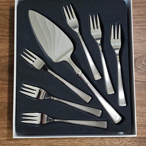 Inneholder seks dessertskjeer L: 14,95 cm og en serveringskje L: 22,35 cm