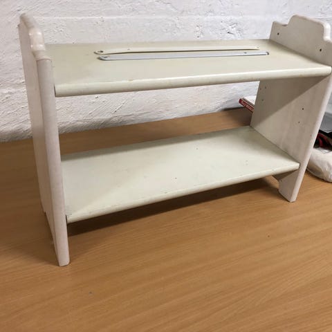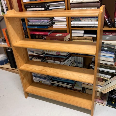 Ganske pen lakkert BBB-reol med fire hyller. Nyere utgave med plastfester på hyllekantene. Demontert for enkel transport. Inkluderer alle skruer og en treavstiver som du ser i bakkant mellom de to øverste hyllene. Hentes på Tåsen i Oslo etter avtale.