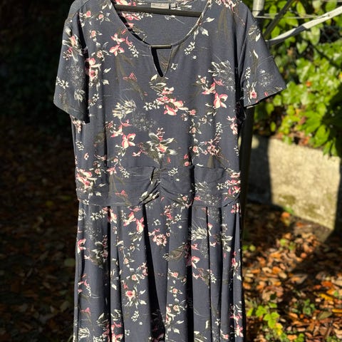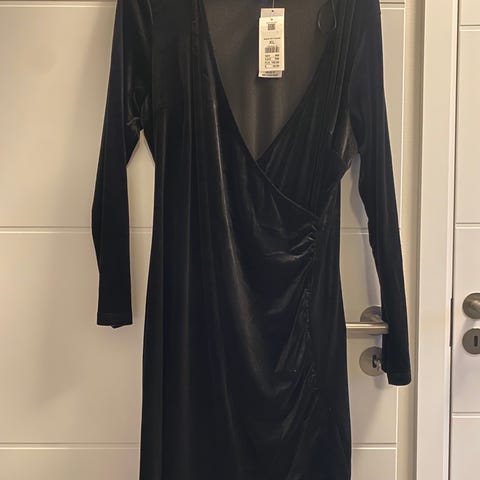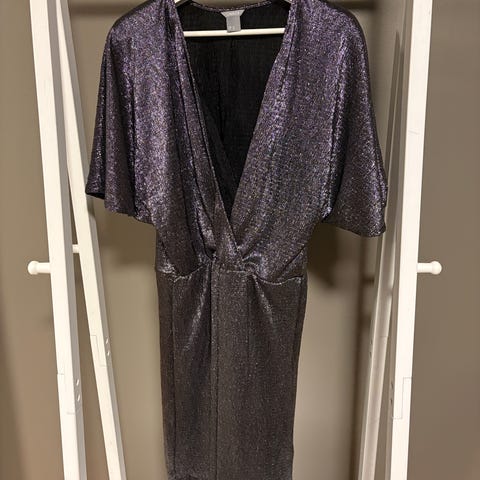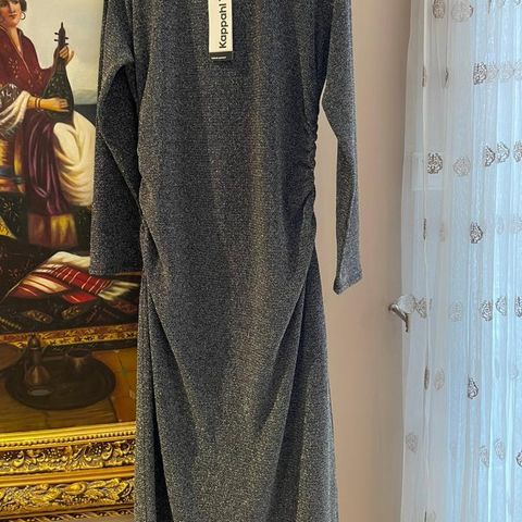 Lindex festkjole i størrelse XL, laget av polyester i sølvfarge. Kjolen har lange ermer og en v-formet hals, med rynkedetaljer på siden. Egnet for kvinner.