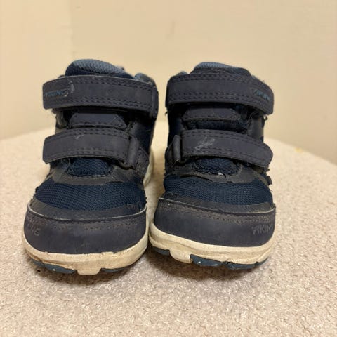 Skoene har en kombinasjon av mørk blått og brunt materiale, med borrelås og lisser for lukking. Sålen er laget for godt grep og stabilitet.