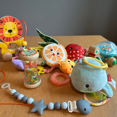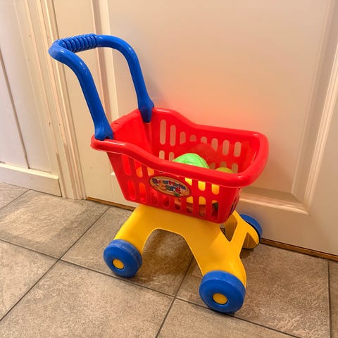 Selger en Bright Starts Shop 'n Cook handle- og gåvogn. Alt fungerer som den skal. Popkorn maskinen blåser kuler rundt og toppen kan tas av