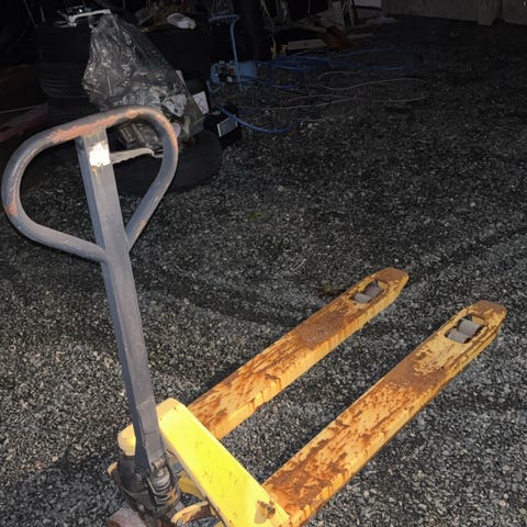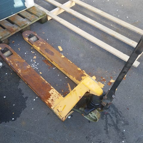 Jekketralle med en løftekapasitet på 2500 kg. Standard gaffellengde. Doble hjul.