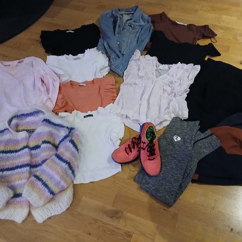 Bukse , genser , t-skjorte , topper , jakke , shorts, dameklær , ungdomsklær , jenteklær , klespakke , klespakker , tights , thermotights , gjenbruk , miljøvennlig , sko , skjerf , sandaler