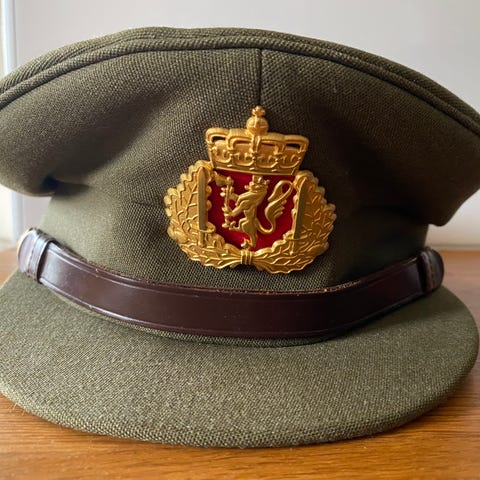 Militær uniform bestående av jakke og bukser i grønt stoff. Jakken har flere lommer og detaljer som skulderklaffer og merke på ermet. Buksene har belte og lommer. Passer til bruk i militære eller historiske sammenhenger. Produsenten: K. Stormark Konfeksjonsfabrikk. Str 48/50. Skjorte følger med.