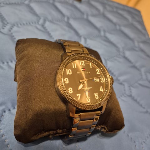 Tommy Hilfiger herreklokke med svart urskive og brun skinnrem med hvite sømmer. Klokken har tydelige hvite tall og visere på urskiven. Remmen har hull for justering og spenne i metall.