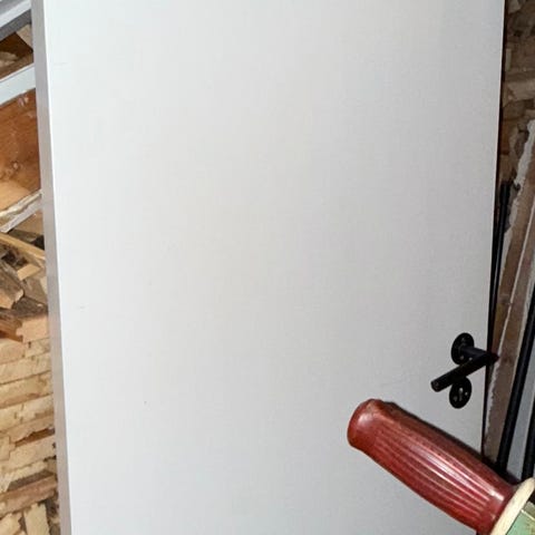 Liten dør i tre, gis bort ved henting. Mål: bredde 58cm. Høyde 190