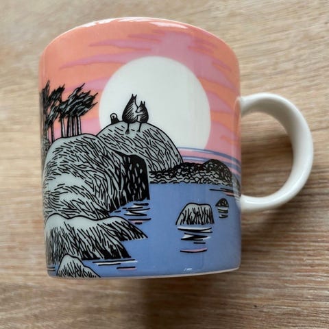 Arabia Mummikopp 3dl «Mummidalen» produsert i 2017 med etiketter selges.