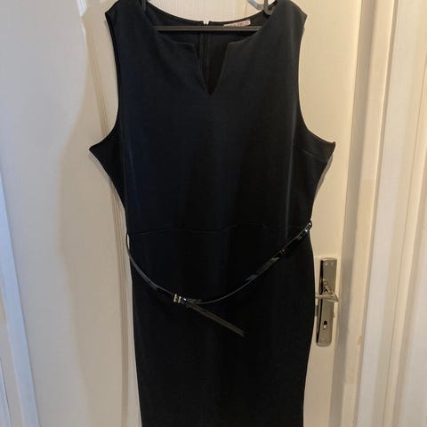 Fin sort kjole fra Anna Field curvey i strl.54, korte armer og knytebelte i midjen. V-hals og krage rundt halsen. Meget behagelig på. Brukt få ganger