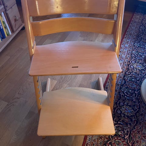 Stokke Høy barnestol i hvit farge med tre detaljer. Designet for barn med justerbar sitte- og fotplate for tilpasning til vekst. Laget i solid materiale for stabilitet og holdbarhet.