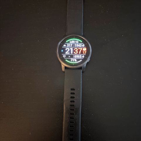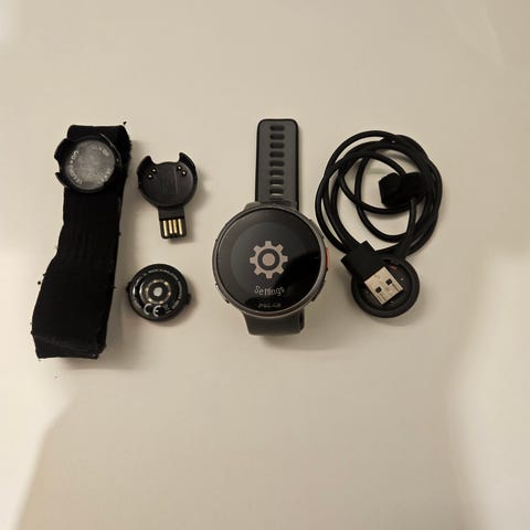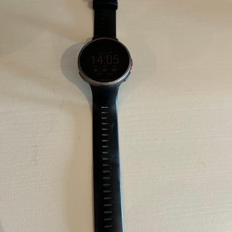 Polar vantage v3 med svart reim. Kjøpt ny november 24. Klokken har en rund skjerm og pulsmåler på baksiden. Den viser tid, dato, skritteller og andre aktivitetsdata på skjermen.