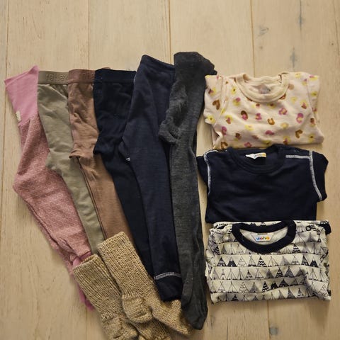 Barneklær i størrelse 86-92 for jente. Inneholder flerfargede plagg med ulike mønstre og materialer, inkludert jeans med regnbueprint og rosa snekkershorts, pysjamas fra Newbie, ullbukse og tights.