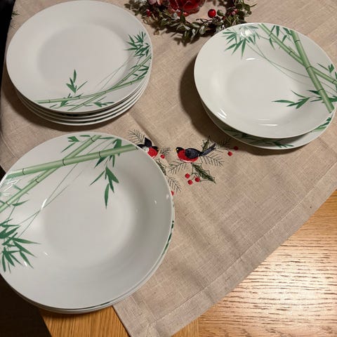 Selges pent brukt deler av service 6 stk middagstallerkener, 7 stk suppetallerkener og en dypt salatentallerken.